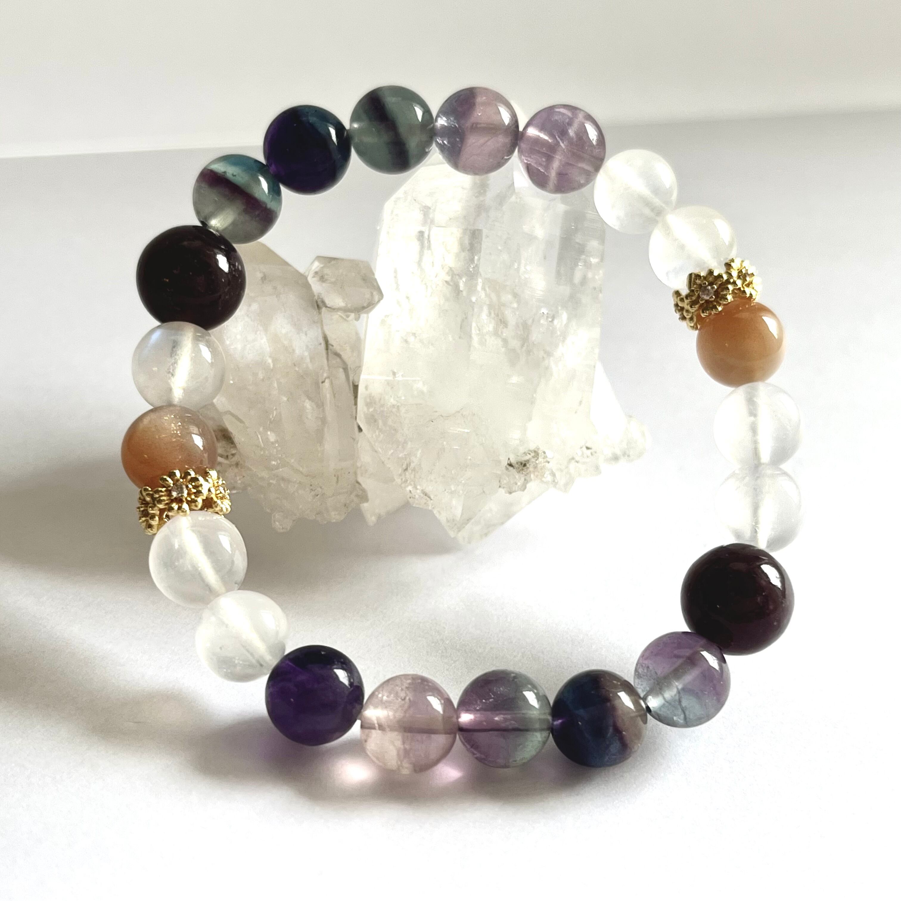 メイン石にレピドライト10mmを使用し、その周りをフローライトとムーンストーンで囲みました。